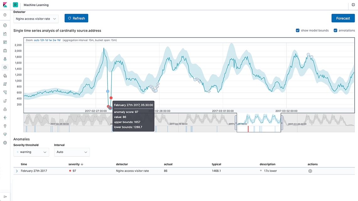 Elastic을 통한 비지도형 머신 러닝은 데이터에서 패턴을 발견하도록 도와줍니다. 시계열 모델링을 이용해 현재 데이터에서 이상 징후를 탐색하고 과거 데이터를 기반으로 한 동향을 예측하세요. 메트릭이 어떻게 쌓이고 있는지 궁금하신가요? 이상값 탐색을 이용해 나머지와 동떨어져 있는 데이터 포인트를 확대해 보세요.