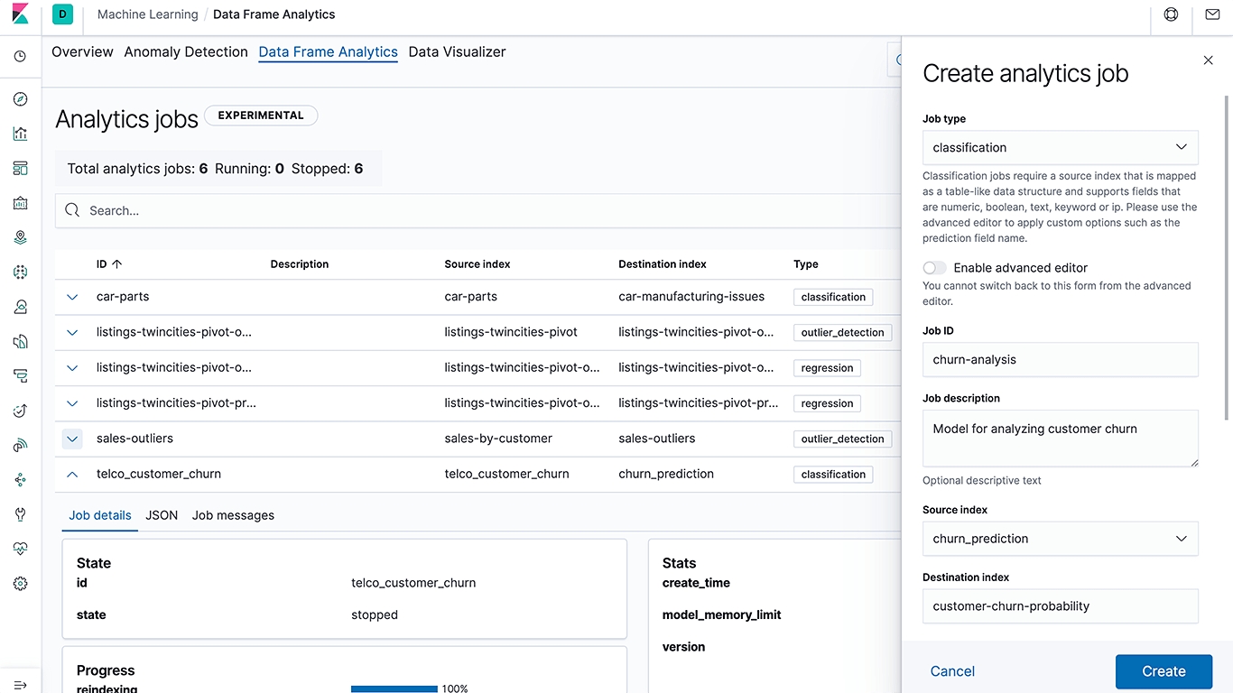 광범위한 사용 사례에 걸쳐 엔드 투 엔드 워크플로우 환경을 위해 데이터에 분류, 회귀 및 이상값 탐색을 적용하세요. 지속적인 인덱스 변환을 사용해 애플리케이션 로그 인덱스를 사용자 중심의 활동 보기로 전환하고, 분류를 사용해 부정 행위 탐색 모델을 구축하세요. 그리고 나서, 유추 수집 프로세서를 사용해 Elasticsearch를 떠날 필요 없이 수집 시에 그 모델을 들어오는 데이터에 적용하세요.