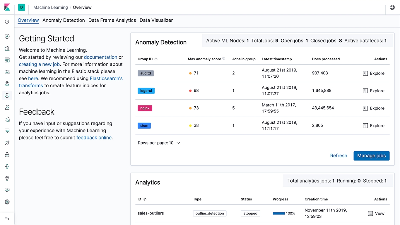 엘라스틱은 시계열 데이터에서 anomaly (이상징후)를 찾아내는 un-supervised 머신러닝과 Classification 기반의 Supervised 머신러닝을 제공합니다.